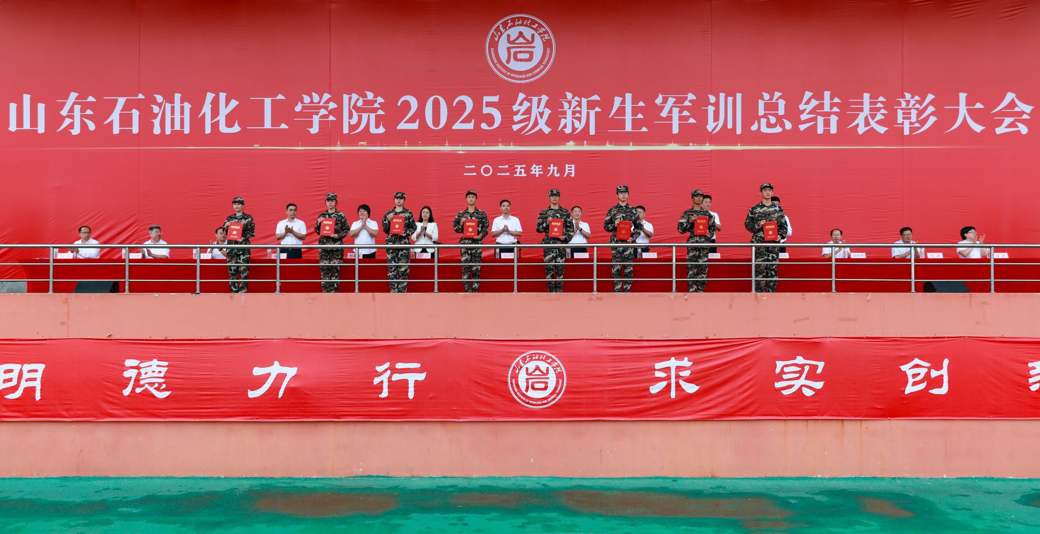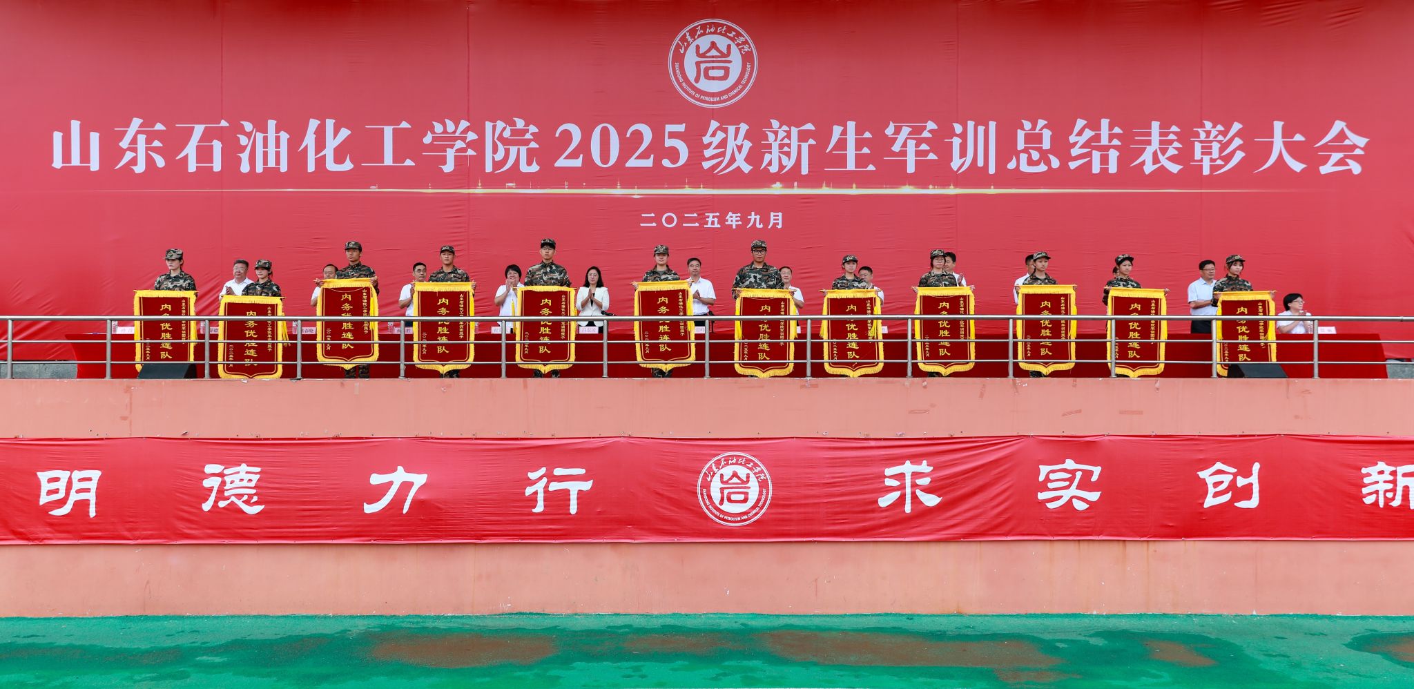 秋高气爽,硕果盈枝。9月28日上午,山东石油化工学院2025级新生军训总结表彰大会在学校体育场隆重举行。校党委委员、副校长张思峰出席大会并讲话,校党委委员、纪委书记、监察专员张崇广向承训单位东营海警局颁发锦旗,校党委委员、副校长吕宏凌主持大会。各教学院、职能部门负责人于主席台就座。