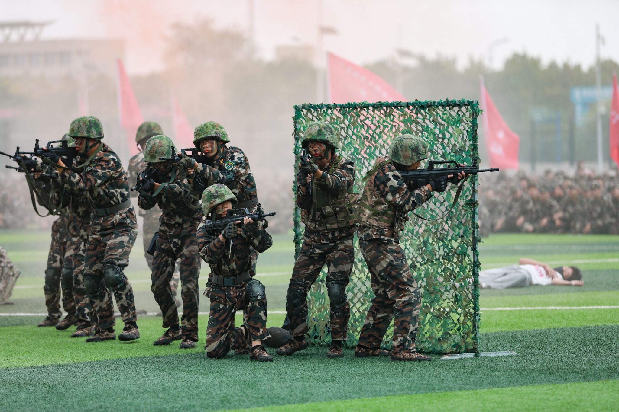 军训成果汇报展示环节中,刺杀操方队动作刚劲有力、气势如虹;擒敌拳方队虎虎生风,招式连贯;战术方队则通过模拟实战场景,展示了新生们灵活应变的能力和扎实的军事技能。同学们巧妙拼出“1945-2025”的字样,高呼“正义必胜、和平必胜、人民必胜”的口号,与抗战胜利80周年阅兵式形成跨越时空的呼应,彰显了军训育人价值与精神传承。