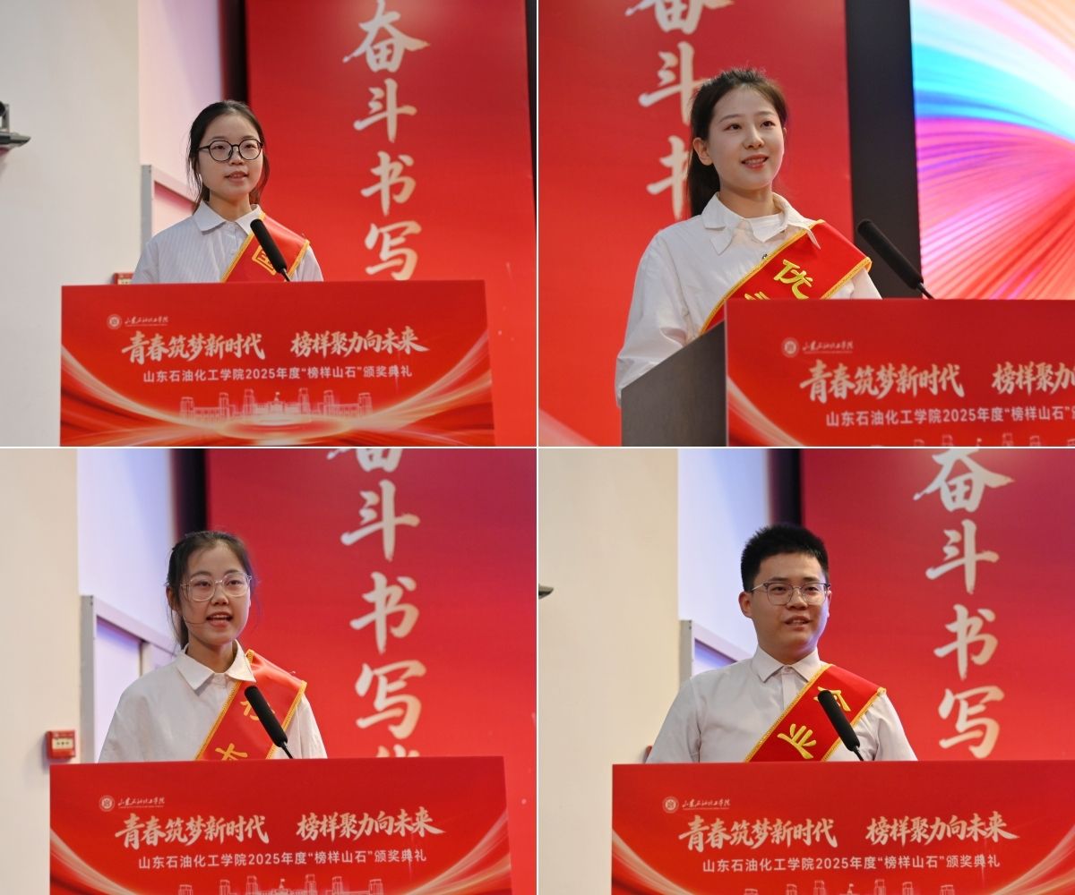 在青年榜样分享环节,国家奖学金获奖代表、信息科学与工程学院 2022级学生仲月,优秀学生干部标兵代表、教育与艺术学院2022级学生周嘉伟,校长奖学金获奖代表、化学工程学院2022级学生崔凤云,企业奖学金获奖代表、石油工程学院2023级学生董庆帅依次进行发言。