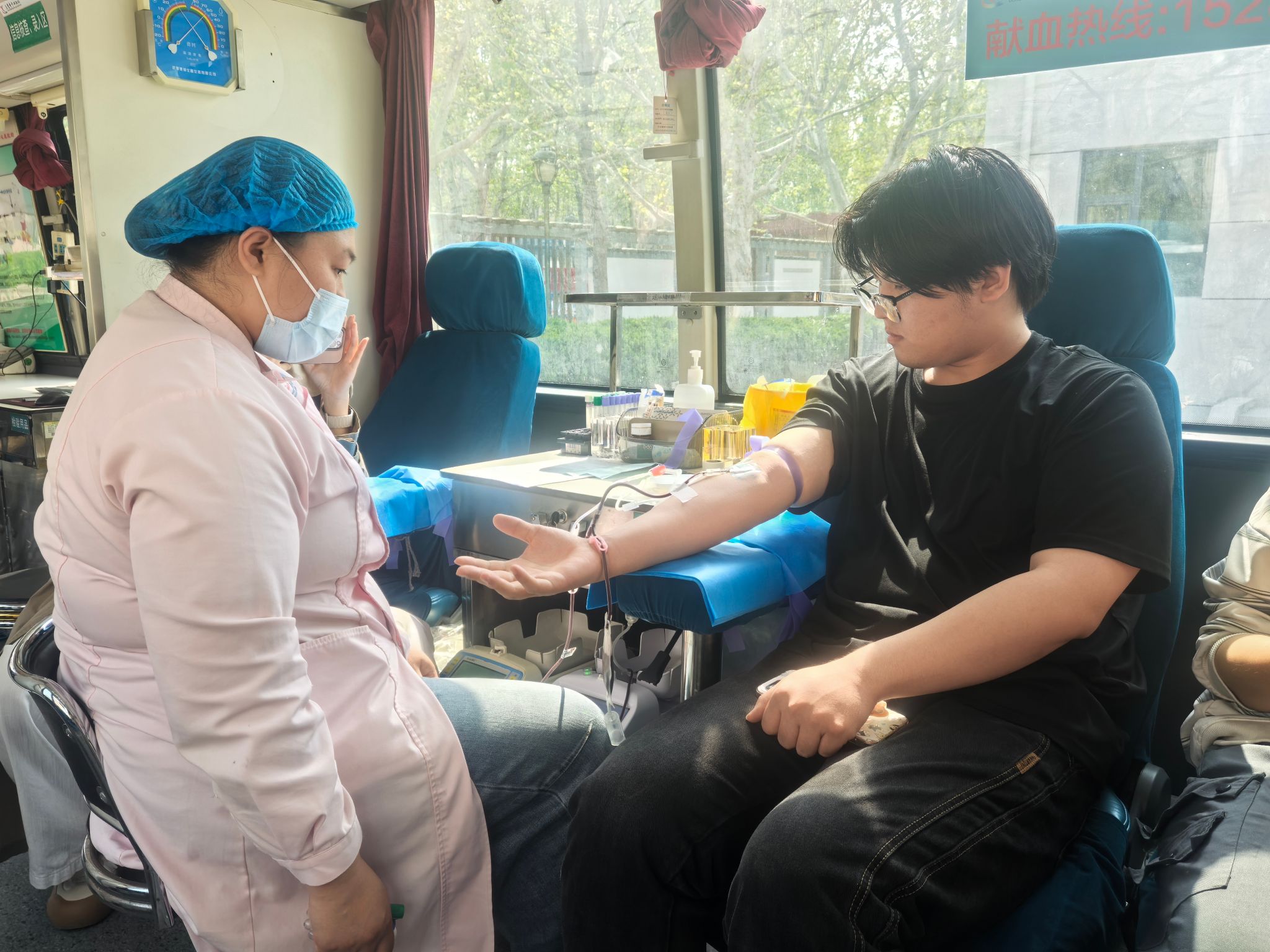 仪式结束后,出席活动的领导一行来到义诊和无偿献血现场,详细了解活动开展情况,并与医护人员、参与献血的学生、志愿者们进行了现场交流。