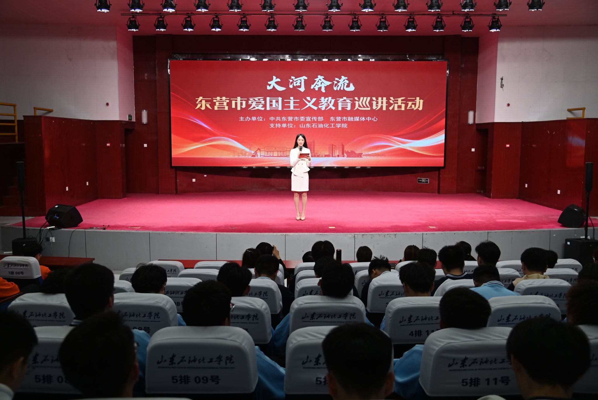 4月14日下午,由中共东营市委宣传部、东营市融媒体中心主办的“大河奔流”东营市爱国主义教育巡讲活动在山东石油化工学院举行。作为全市巡讲第二站,活动以红色故事为纽带、以精神传承为内核,吸引师生齐聚一堂、共沐信仰之光,厚植家国情怀、砥砺奋进初心。